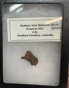 Henbury Meteorite – a meteorite fragment from Henbury Australia. This meteorite was discovered in 1931. This fragment weighs 6.5 g and measures 25 mm x 12 mm (0.4″ x 0.2″). It comes in a Ryker mount case to protect it.